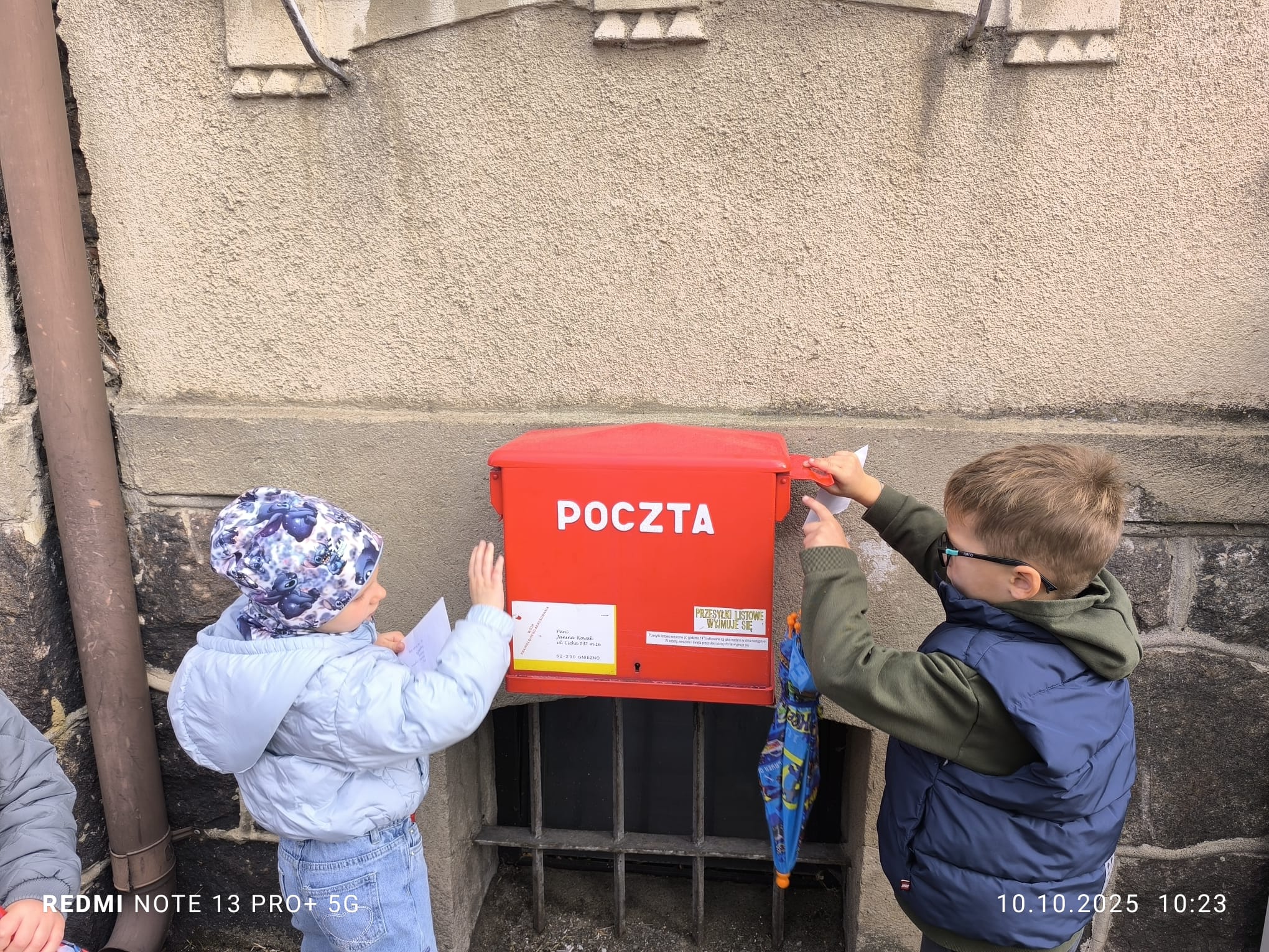 Dwoje dzieci wkłada listy do czerwonej skrzynki pocztowej