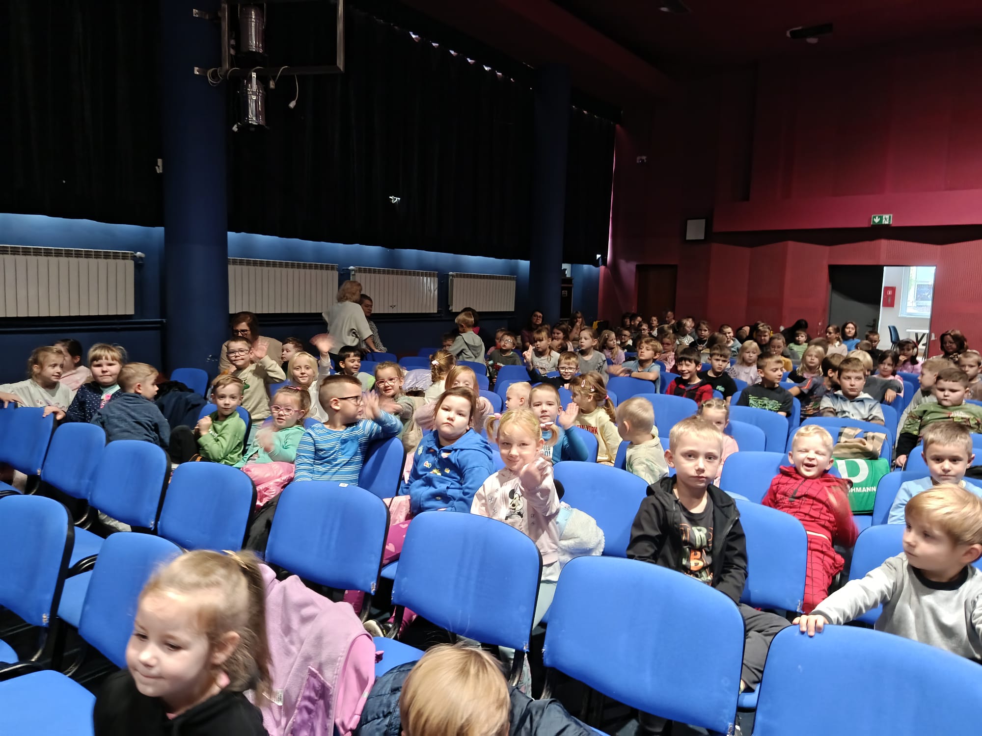 Grupa dzieci siedzi na niebieskich fotelach w dużej sali