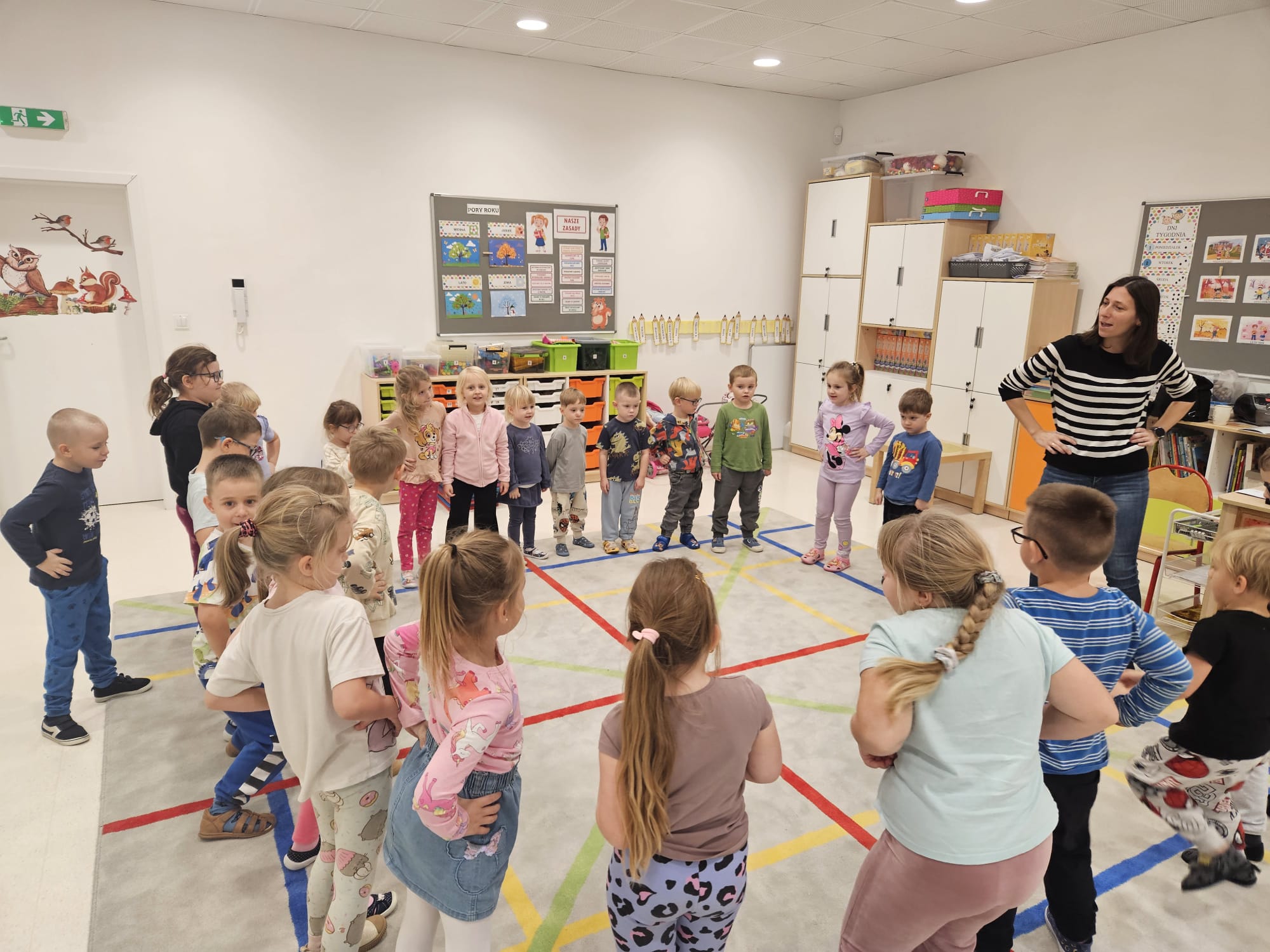 Grupa dzieci i nauczycielka w przedszkolu podczas zajęć